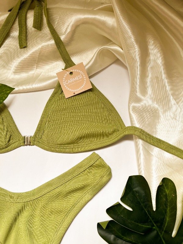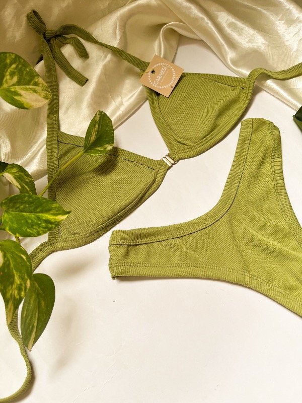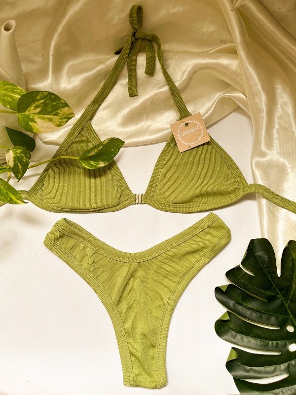 Bikini triangulito unido por un broche, tasas desmontables. Colaless entera en V. Tela morley.