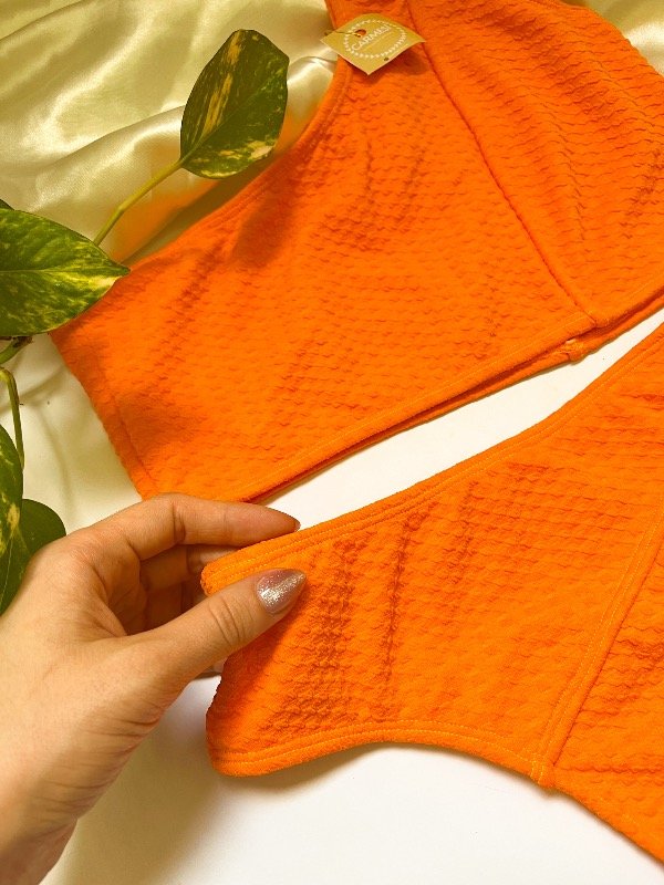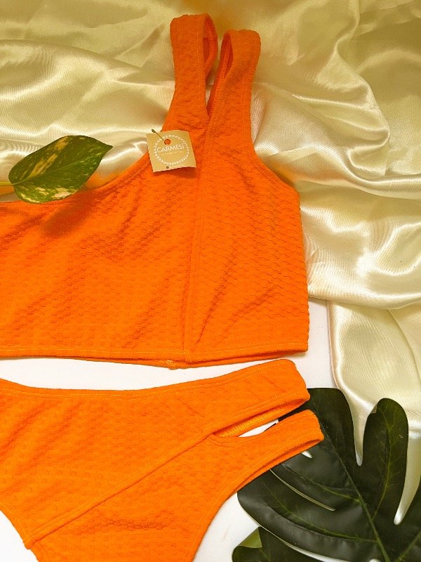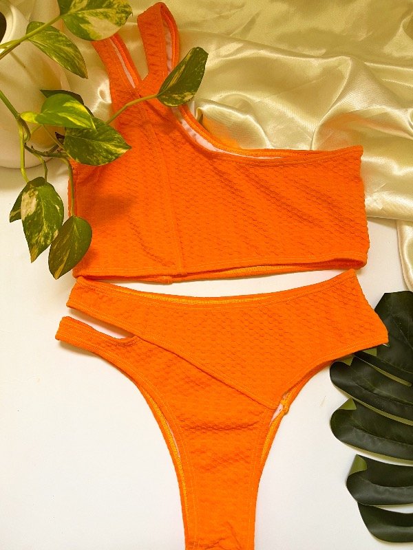 Bikini tipo top a un hombro. Sin tasas y colaless tiro alto